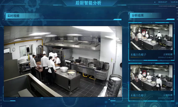 AI加持视频分析,规范后厨作业行为,强化后厨管理,打造阳光厨房,确保食品健康。