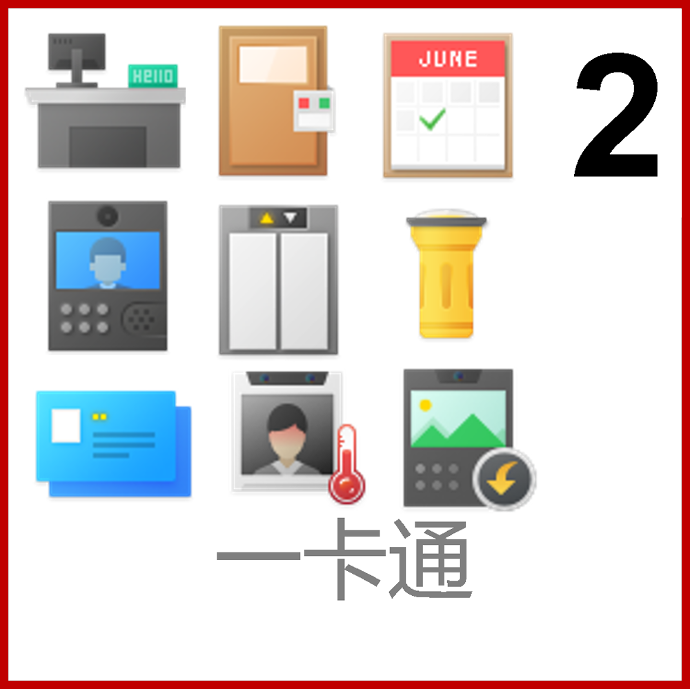 包括人员发卡、门禁、访客、可视对讲、梯控、巡更、考勤、园区测温、信息发布;利用卡片、人脸、指纹等媒介,实现身份识别、出入管控、巡更、考勤、食堂消费等智能应用