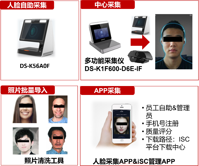人脸采集方式包括:USB相机、中心录入仪DS-K5603F-D、多功能采集仪、批量导入人脸照片、从DS-K5603/CJ中同步
