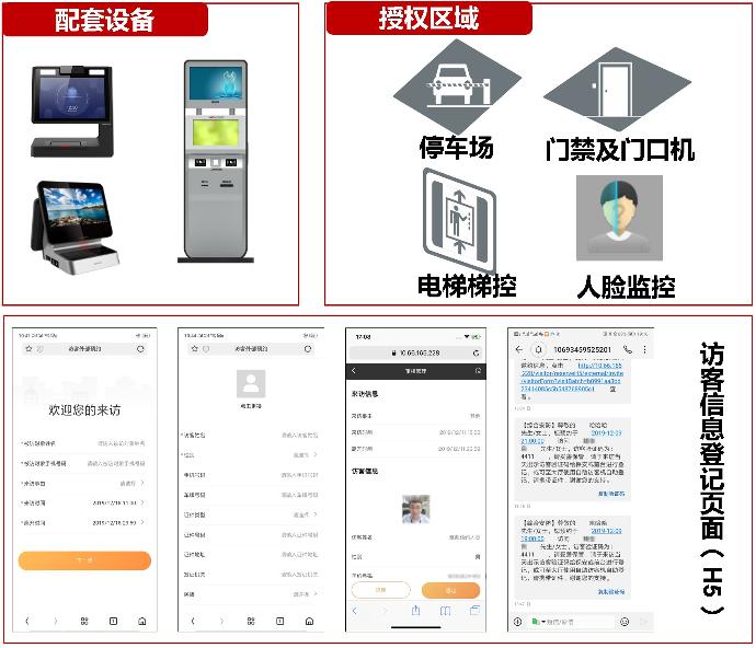 - 已预约的访客通过二维码、身份证、验证码快速完成登记,获取访客卡或访客单。未提前预约的访客现场填写信息登记。通行权限自动下发至相关设备(车辆出入口、门禁、梯控)