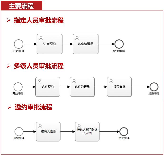 ◆ 支持通过平台的工作流组件,自定义配置用户需要的访客预约审批、内部员工邀约审批流程,解决现有审批流程过于单一无法适配复杂审批场景的问题
