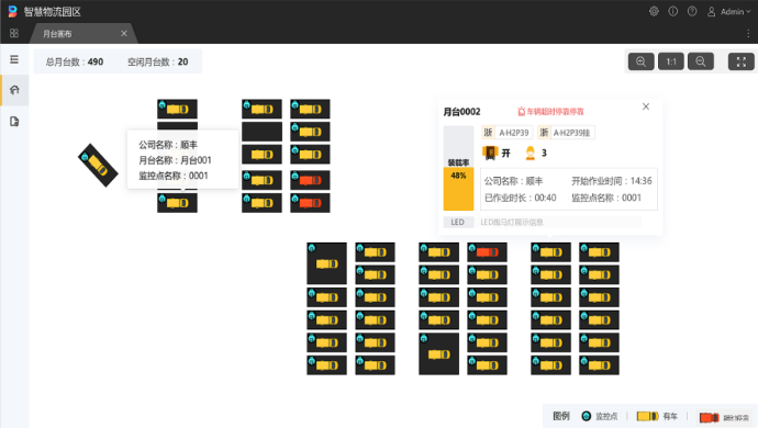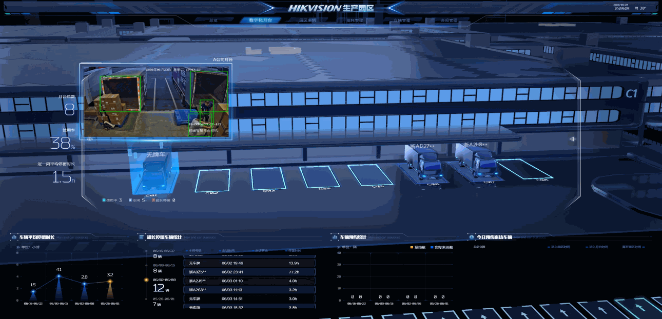 解决方案:通过智慧月台相机实现总部分拨中心4个仓库280个月台的信息感知能力,如月台占用状态、车辆占用时长、装载率等,并将信息推送给业务系统加以应用,赋能园区物联感知能力。