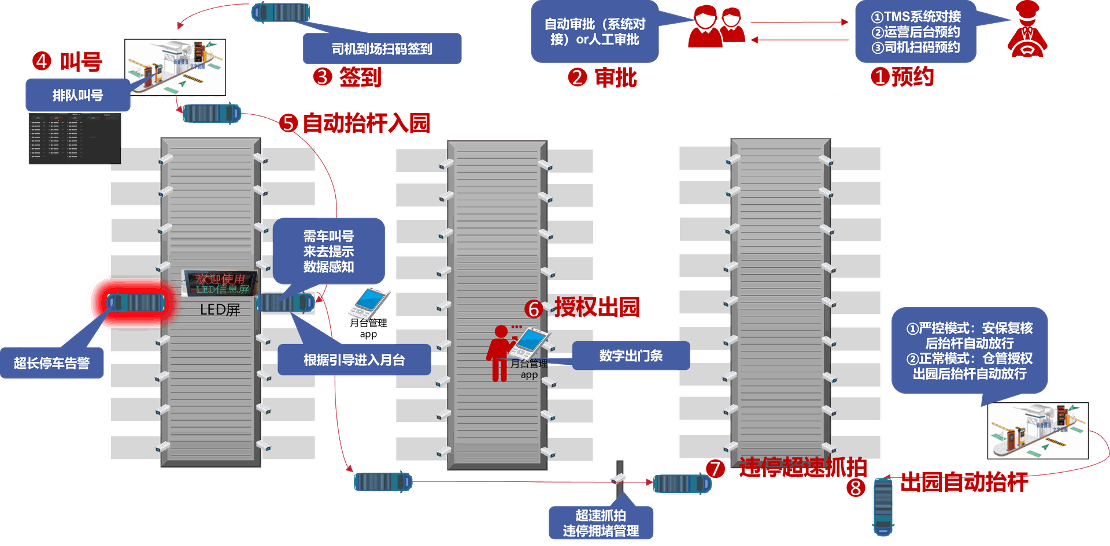 叫号后车辆自动抬杆入园,记录车辆入园时间,园区内超速、违停事件追溯至司机及承运商。