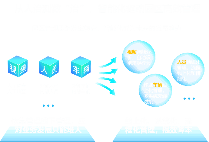 解决方案:优化物流园区业务操作流程并且实现业务流程线上化管理,将园区人员、车辆、月台等要素深度融合,从整体上促进园区运营效率。业务环节数据全面感知,数据资产的积累及应用。