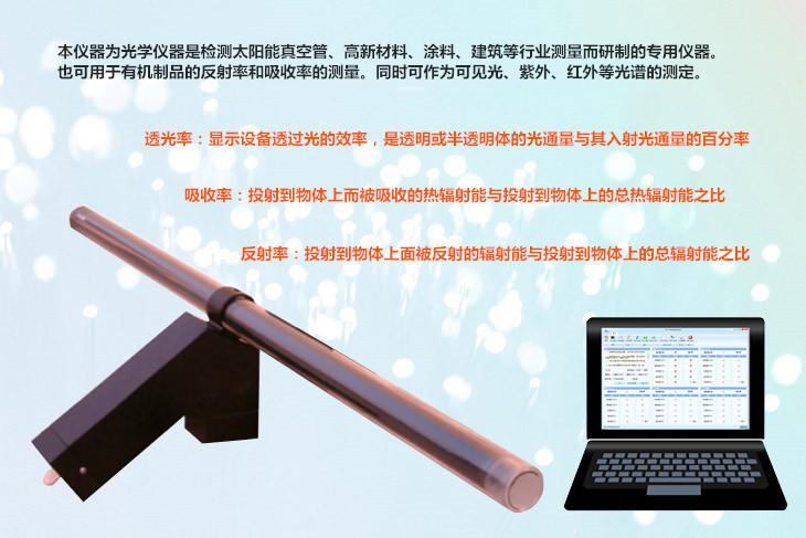 本仪器为光学仪器是检测太阳能真空管,太阳能集热器及高新材料、涂料、颜料、建筑等行业精确测量而研制的专用仪器,它可用于各种太阳能真空管,太阳能集热器涂层、漆膜、油脂、簿膜、塑料制品、有机制品反射率和吸收率的测量。