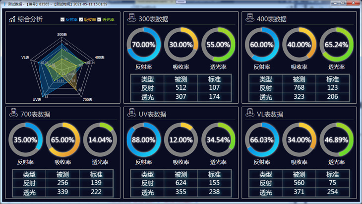 • 检测数据自动存储,实时显示测试结果,自动计算并绘制反射率,吸收率,透光率曲线图。